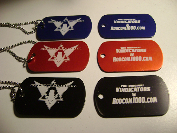 The Original Vindicators Dog-Tags in Black, Red, or Blue randomly.
